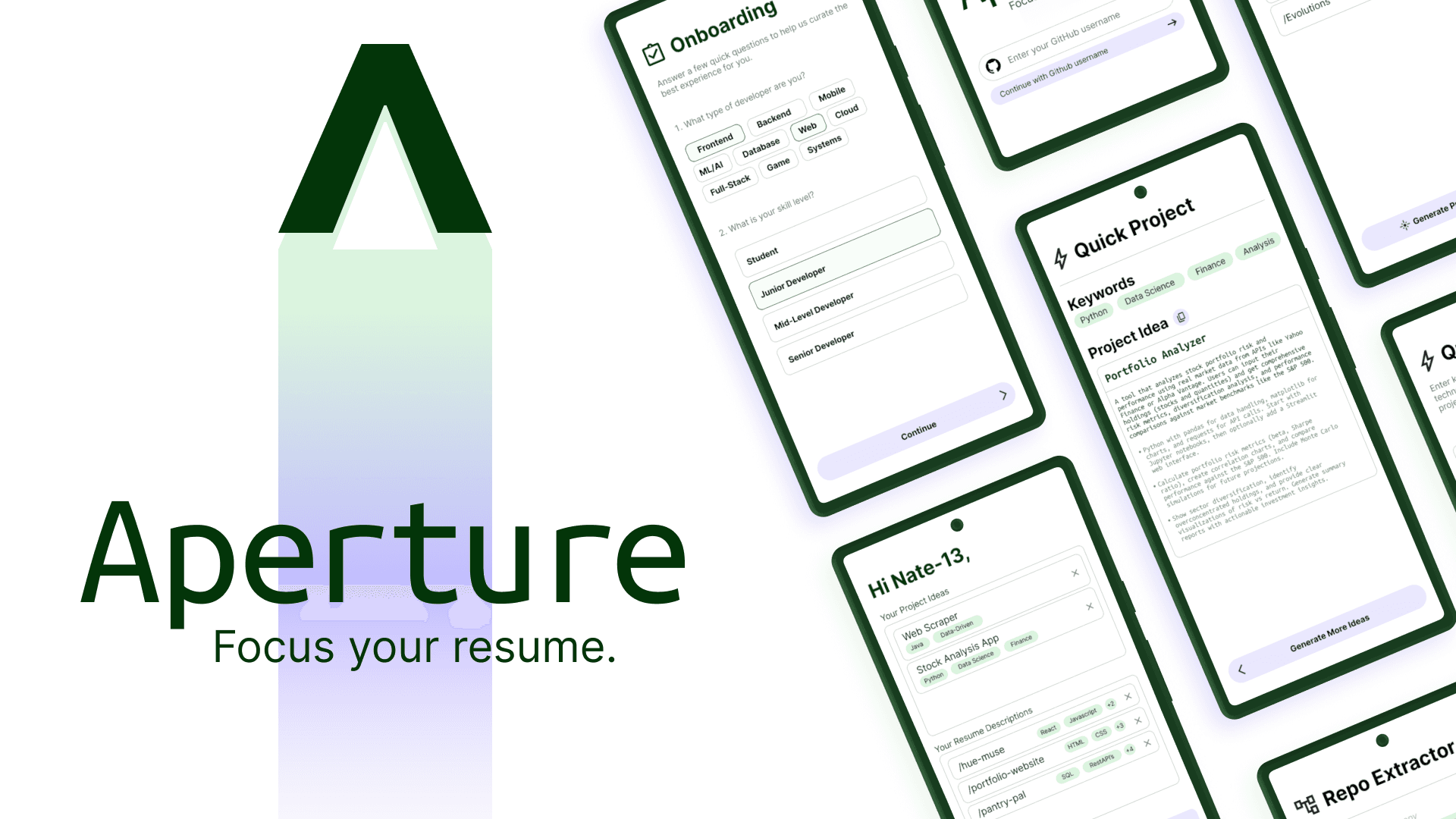We had a ton of ideas we didn't get to. We want to make Repo Extractor smarter, let users connect private repos, or even link to personal websites. Dark mode is on the list (even though I love the light theme). I'd also love to add a Resume Reviser that tailors your resume to job descriptions, and maybe even generalize Aperture for other fields, not just developers.