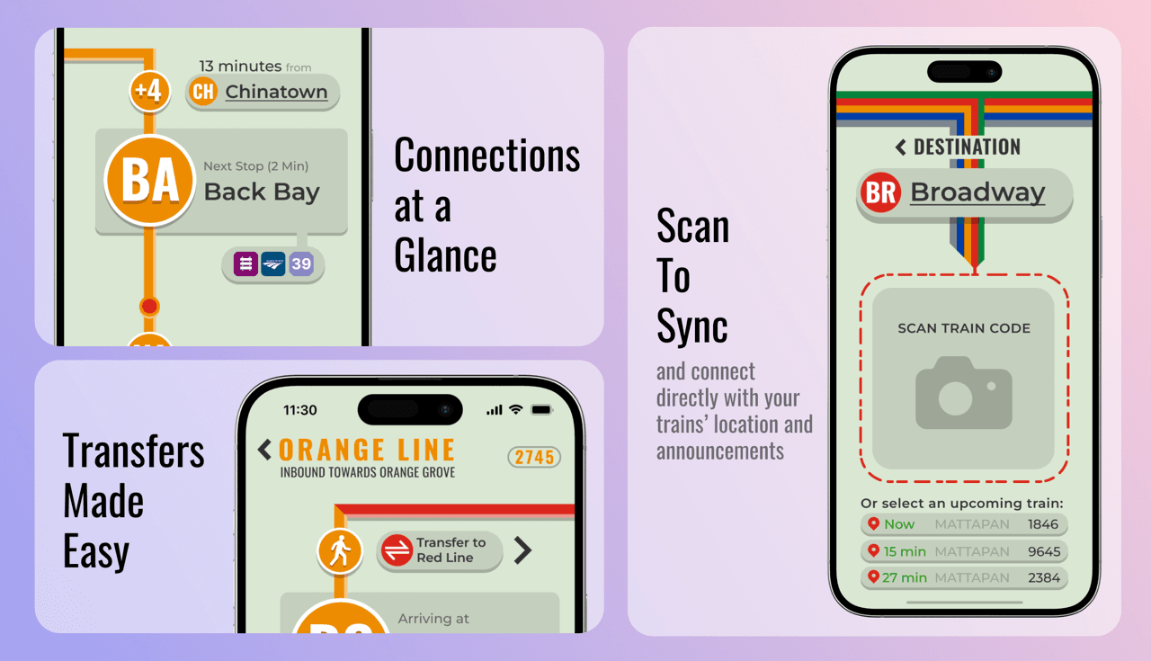 Navigating the underground with traditional tools like maps and station signs can be frustrating—they're often outdated, inconsistent, and lack real-time updates. Even modern apps like Apple and Google Maps aren't fully equipped for the intricacies of Boston's subway system, often missing key details and accurate underground tracking. These tools offer a basic overview, but they fall short when it comes to the specific needs of riders. My app is designed to connect directly to the train you are on, providing specific and relevant updates and announcements directly to your palm.