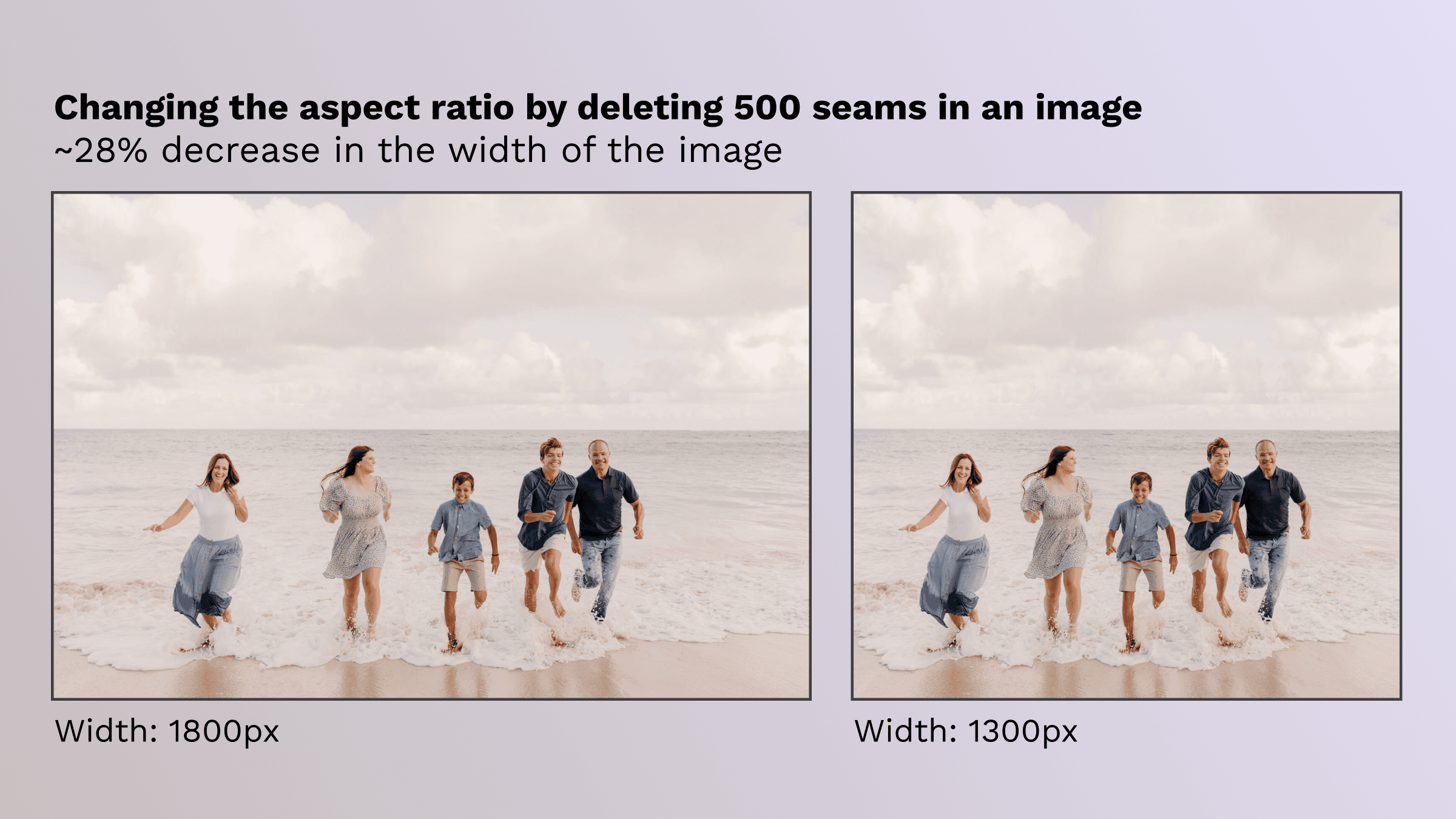 One of the most powerful applications of seam carving is changing an image's aspect ratio without the typical distortion you'd see from simple stretching or cropping. This makes it particularly useful for adapting images to different screen sizes or layouts while maintaining the visual integrity of the important content in the image.
